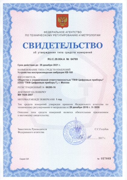 В этом качестве прибор воспроизводит вибрационный сигнал с заданными частотой и амплитудой для проверки виброизмерительной аппаратуры.
