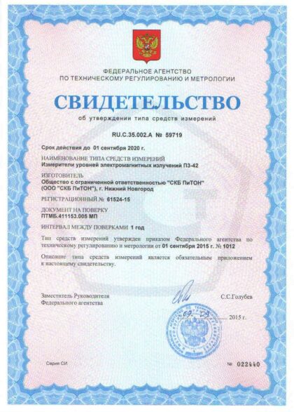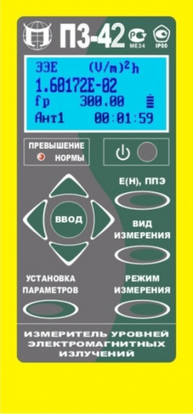 Измеритель уровней электромагнитных полей П3-42 c расширенным выводом информации, обеспечивающий оценку плотности потока энергии (ППЭ) и среднеквадратических значений напряженности электрического и магнитного полей в режиме непрерывной генерации в диапазоне от 10 кГц до 95 ГГц, предназначен для выполнения измерений уровней электромагнитных излучений в соответствии с действующими правовыми и нормативными документами Госкомэпиднадзора РФ, такими как: