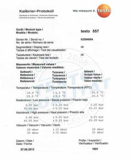 Предустановленные хладагенты60 хладагентов; R11; R12; R123; R125; R1234yf (на дисплее: T8) Возможно обновление списка хладагентов (через службу тех. поддержки Testo); R1234ze; R125; R13B1; R134A; R14; R142B; R152A; R161; R22; R227; R23; R290; R32; R401A; R401B; R401C; R402A; R402B; R404A; R406A; R407A; R407B; R407C; R407D; R407F; R408A; R409A; R410A; R411A; R412A; R413A; R414B; R416A; R417A; R420A; R421A; R421B; R422A; R422B; R422C; R422D; R424A; R426A; R427A; R434A; R437A; R438A; R502; R503; R507; R508A; R508B; R600; R600A; R744O₂; R718 (H₂O); Обновление через мобильное приложение