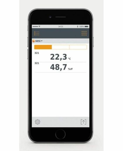 Тесто 605i передает измеренные значения по беспроводному каналу Bluetooth на Ваш смартфон или планшет. Установив приложение testo Smart Probes на Ваше мобильное устройство, Вам будет удобно просматривать данные измерений. Также с помощью приложения можно производить автоматический расчет температуры точки росы и шарика смоченного термометра. Все измеренные значения отображаются в виде таблицы или графика и могут быть импортированы в отчет, а затем переданы по e-mail в виде файлов PDF или Excel.