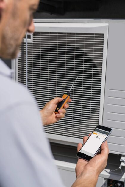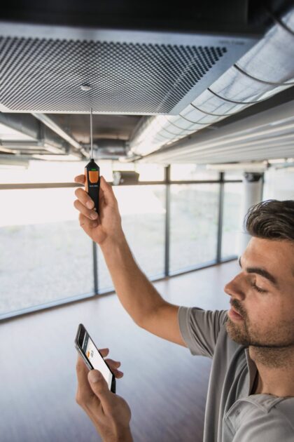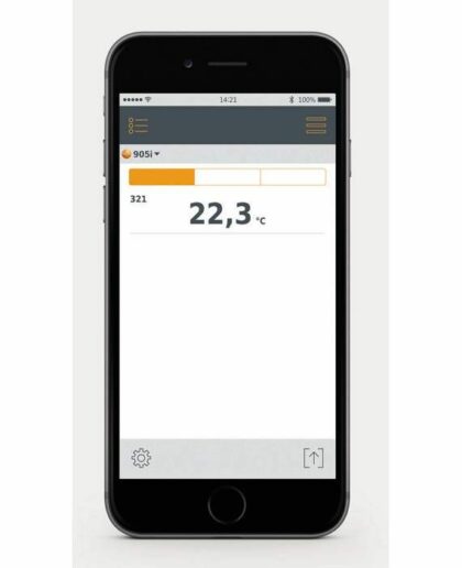Компактный профессиональный термометр с Bluetooth Тесто 905i в комбинации со смартфоном или планшетом идеален для измерения температуры окружающей среды, а также температуры в воздуховодах и на вентиляционных решетках.